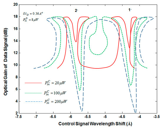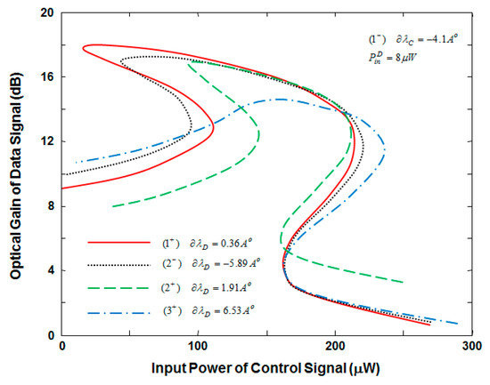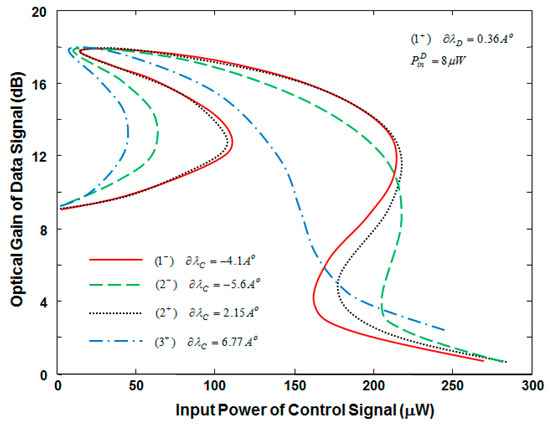 The shape of the spectral bistability, as well as the hysteresis width, can be adjusted by changing input parameters. The optical gain of the data signal is shown in Figure 5 as a function of for different control-input power (). A dip in the data gain, which occurred at = −4.1 Å or −5.6 Å when is increased, was due to gain saturation caused by large control gain. The dip split the mode into two regions; upper bistable region and lower bistable region for < 100 µW. This feature was obtained when the control and data wavelengths are properly detuned by 0.4 Å and 0.16 Å above the mode unsaturated wavelength. According to Figure 5, the upper bistable region of all modes is shifted to higher wavelength and the lower bistable region is shifted to lower wavelength when is increased. When reaches 200 µW or more, the lower wavelength side of mode and the upper wavelength side of mode merges and becomes stable. According to Figure 4 and Figure 5, bistability is limited to a narrow wavelength range.