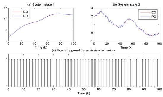 To compare the estimation performance, the state estimation trajectories without fault are shown in Figure 1a,b which reveal comparison between our filter using event-triggered data-transmission (ED) and the proposed filter using periodical data-transmission (PD). The event-triggered transmission behaviors are also illustrated in Figure 1c. As shown in Figure 1, two lines are almost coincident as time increases. Obviously, the estimation accuracy is not affected by the event-triggered data transmission scheme.