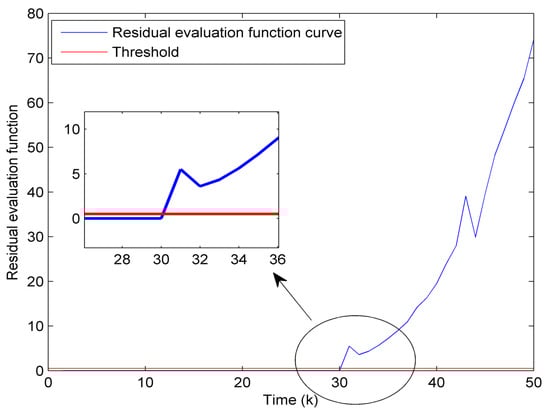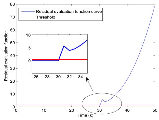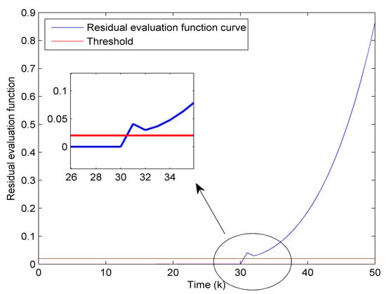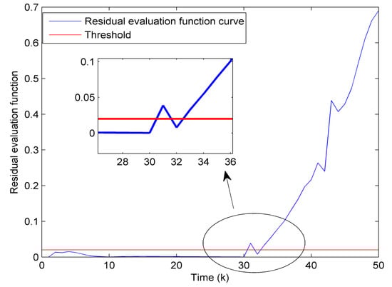 As mentioned in Section 3.1, the responsibility of the residual evaluation is to produce appropriate fault alarms. The prescribed evaluation function is compared with the predefined threshold . If the value of the evaluation function exceeds , an alarm of fault is triggered. We choose