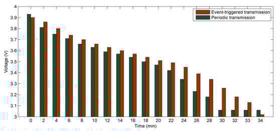 In the final experiment, an experimental node is applied to test its lifetime to verify whether the proposed event-triggered scheme is energy-saving. As shown in Figure 7, the node includes the following components: (i) a STM32F103 micro-controller (computation module) with ARM cortex-M3 CPU determines when to transmit data packets via our event-triggered scheme; (ii) an ESP8266 wireless transceiver (wireless communication module) transmits data packets from sensor to remote fault-detection filter; (iii) a 75 mAh lithium-polymer battery system (power management module) ensures a constant voltage output received from the Lithium-ion battery; and (iv) a digital voltmeter is regarded as a battery lifetime monitoring system. Please refer to the user manuals [,] for more information about this node. The relationship between time and voltage for periodical and event-triggered scheme is illustrated in Figure 8. It is not difficult to find that the final battery lifetime for periodical and event-triggered data-transmission are 30 min and 34 min, respectively. In other words, the battery life is extended by 11.7%, and thus the wireless node can be used for a longer time to become more energy-efficient.