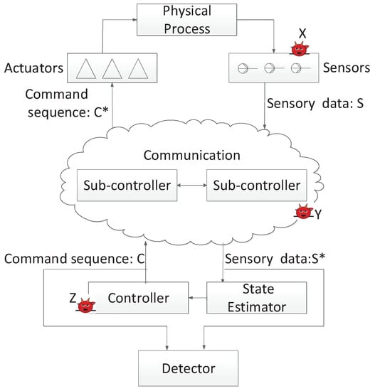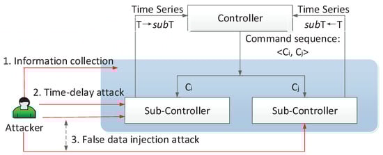 However, with the wide open of communication infrastructure which is used to improve efficiency, reliability, and sustainability of supply [] such as smart grid, the new vulnerability has been exposed []. The attackers can utilize the vulnerability to destroy CPS, and the power outages in Ukrainian is one of the examples []. There mainly exist three attack entry points as shown in Figure 1: attacking sensors such as false data injection [,,,], attacking controllers such as false command injection [], and attacking communication system such as jamming the communication channel (DOS attack) [,,] and time-delay attack [,].