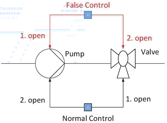 In this paper, we mainly focus on one threat called false sequential command attack. False sequential commands refer to a set of commands whose legal order is disordered leading to the false control. For example, in Figure 2, under the normal situation, the command that turns on the pump needs to be executed after turning on the valve. This kind of attack tries to delay the time of turning on the valve until the command turning on the pump is executed, which may cause the disruption of physical components and even have a blast.