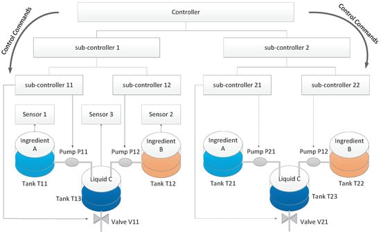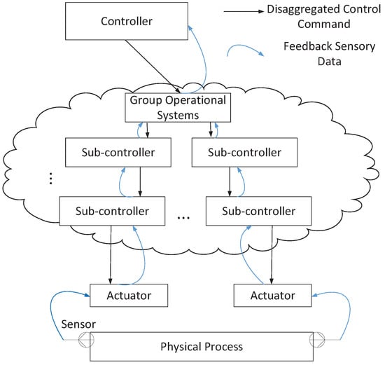 Because of large scale and complex transaction, a typical hierarchical communication system is used in many large-scale CPSs [,,], including many sub-controllers. Figure 3 shows the structure of communication system [].