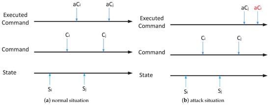 Countermeasure 2: Event correlation based detection [,]. Event correlation is used to identify the false command control. An event correlation refers to the correlation among multiple commands. For simplicity, we only use two commands as an example to illustrate this method. When command always occurs after command is issued in the normal situation, sequence is seen as a correlation. When occurs, an alarm is shown.