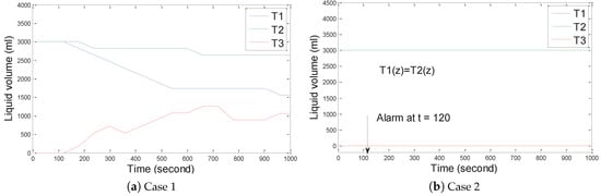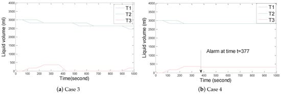 Figure 8b shows the real values of , , and under attack case 2. When the disaggregation of is delayed, the state is still . Until the command is disaggregated at s, the state transition has an exception and an alarm occurs. During the process, the liquid of Tank is 0 mL. Attacks can be identified and there is no economic loss.