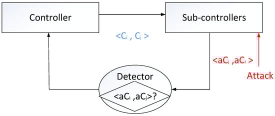 A cyber-physical system (CPS) is the tight combination of physical system and information system, including a controller, actuators, sensors, critical state estimation, detector, and communication system [,]. A simplified CPS model is described in Figure 1. The controller issues command to control actuators according to the estimated state. Actuators operate in the physical world and the physical process is sensed by sensors. Sensors transmit the sensory data to the critical state estimation, and then the critical state estimation evaluates the current state of the physical system. The detector collects commands from the controller and the sensory data to judge whether the system state or command is legal. Once an illegal state or command occurs, an alarm is given.