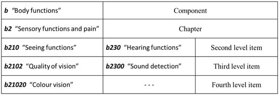Each of the four components is identified by a letter (“b” for Body functions, “s” for Body structures, “e” for Environmental factors, “d” for Activities and Participation) and can be detailed by adding digits. According to the number of digits following the letter, it is possible to get a code (up to five digits), whose length indicates the level of granularity. The lesser the number of digits following the letter is, the more general the health related-concept is described; contrariwise, the higher the number of digits is, the more extensively and thoroughly a health-related concept is represented. The following Figure 1 shows an excerpt of the whole classification representing some of the problems related to visual and hearing functions: