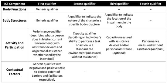 A description of all the possible qualifiers applicable for each ICF component and their meanings (according to References [39,44]).