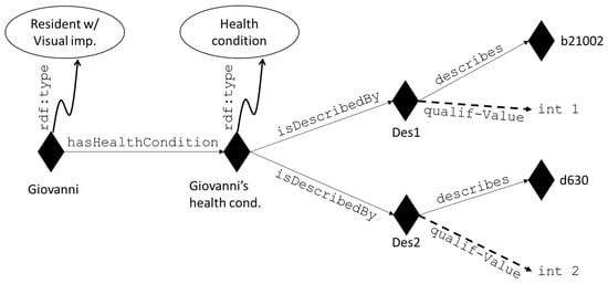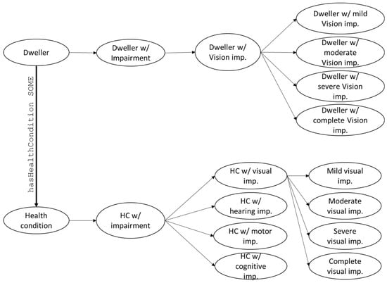 The development of the DSS and its underlying semantic knowledge-base starts from the definition of the dwellers—the end-users of the results generated by the DSS. Considering that a smart home must be able to provide tailored services to its residents, by anticipating their desires and helping them in coping with their impairments, the possibility to describe the dwellers and their health conditions in a holistic way is a topic of a paramount importance. Health conditions’ description must define the appropriate level of detail for the physical and physiological status of an individual over time, such as their abilities in the environments where they live, and the eventual cognitive decline occurring with ageing. In order to cover these crucial aspects of dweller-related knowledge, the ontology relies on the International Classification of Functioning, Disability and Health (ICF) [39].