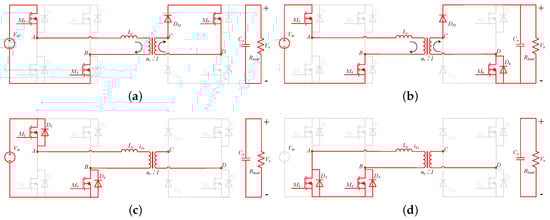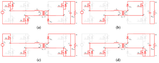 Equivalent circuits corresponding to the first four intervals in Mode A: (a) Interval 1 []; (b) Interval 2 []; (c) Interval 3 []; (d) Interval 4 [].