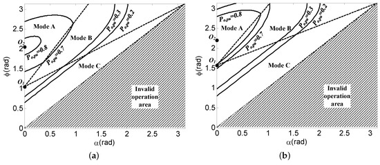 According to both boundary conditions, the operating range of each mode is shown in Figure 7 for and , respectively.