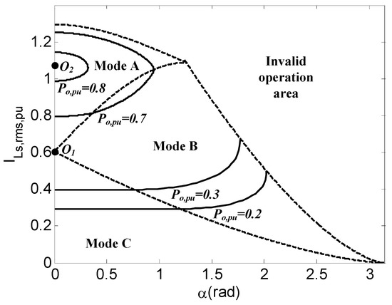 Based on Table 1 and Table 2, the relationship between normalized inductor RMS current and phase-shift at different power contours are shown in Figure 8, with as an example. It can be found that, at the high power levels, the converter may work in Mode A. values can arrive at the minimum values when the converter is operated at conventional secondary phase-shifted control from to along the -axis. At the low power levels from to zero power , the converter may operate in Mode C, in which is minimum and constant for the same power level.
