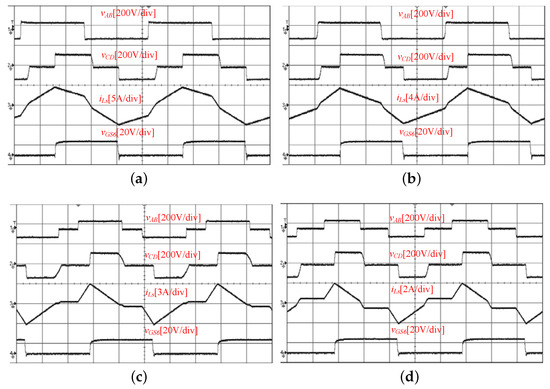 A series of experimental tests are then performed along the proposed minimized rms current route. The boundary power between the two stages of the control route is calculated to be 52% load, i.e., 104 W. Thus, the converter works in CCM (Mode A) at the high power of 200 W and 150 W. Two phase-shift angles are calculated as , (200 W) and , (150 W) according to (8). Experimental results of 200 W and 150 W are shown in Figure 12a,b, respectively. It can be seen from those two figures that the inductor current is continuous. The related waveforms satisfy the operation condition of and all switches can operate at ZVS.