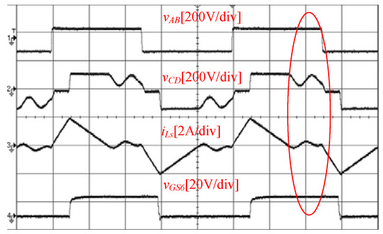 When the output power is lower than 52% load, the converter is operated at the boundary between Mode B and C. Using (9), two phase-shift angles are obtained as follows: (1) 100 W, , ; (2) 50 W, , . Experimental results of 100 W and 50 W are shown in Figure 12c,d, respectively. It can be seen that the transition moment of from to zero happens at the zero-crossing point of the inductor current and there is a small zero-current duration. The operation conditions of two experimental results match the boundary feature between both DCMs. In addition, the voltage ringing on the waveform is prevented in comparison to DCM under conventional secondary phase-shifted control (Figure 13). Based on these experimental results, the values of the RMS current, peak current, and efficiency are listed in Table 5, where the highest efficiency can arrive at 95.53% for 150 W. For 50 W operation with conventional control in Figure 13, the measured efficiency is 88.46%. It is seen that the efficiency using the proposed control is improved slightly since the current values and the switching behaviour under the two control methods are almost the same and the loss due to the ringing accounts for a small portion of total loss. However, the removal of the ringing phenomenon depresses EMI so that the risk of distortion in gating signals is reduced and the operation stability is improved consequently.