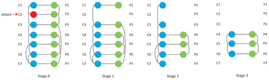 In Figure 1, there are 14 nodes in the Cyber-Physical network, and . The values of and are 1 and 0.5, respectively. In stage 0, attackers attack node , and fails. In stage 1, node fails because its support node has been failed in stage 0. In stage 2, the load of has been redistributed to node and ; the load of has been changed to 5/3 and exceeds its capacity 3/2, so node fails; the load of has been changed to 10/3 and exceeds its capacity 3, so node P3 fails; then, the load of P3 has been redistributed to node P7, and the load of P7 has been changed to 13/3 and exceeds its capacity 3/2, so node P7 fails. In Stage 3, nodes , and fail because their support nodes , and have failed in stage 2. Finally, the interdependent Cyber-Physical sub-network reaches the stable state. Each node in the cyber sub-network belongs to the giant component and has a support node from the physical sub-network, and each node in the physical sub-network is not overloaded and has a support node from the cyber sub-network.