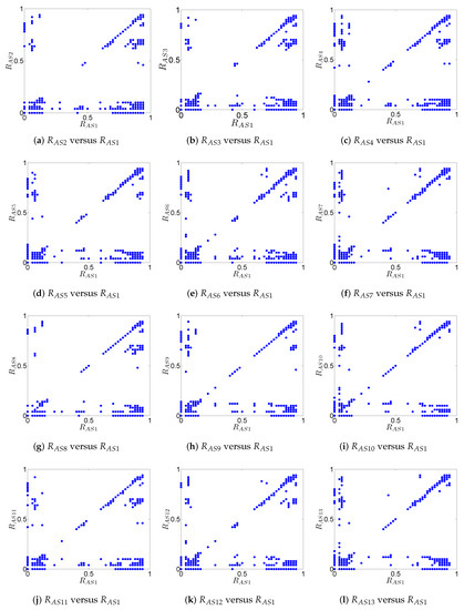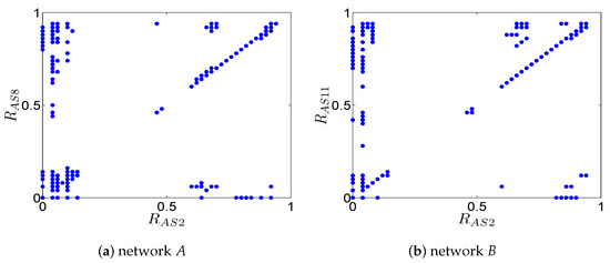 In this subsection, we would mainly focus on two questions: (i) in the Cyber-Physical system, whether the target sets exist with whom sequential attack would cause more damage; and (ii) if the target sets exist, are they one-to-one corresponding to the single physical subnetwork? According to the model we propose in Section 2, we design the following simulations. An interdependent network with is constructed, and the cyber subnetwork and physical subnetwork have the same size(). The two subnetworks are generated by the algorithm proposed by Barabasi et al. [26], so the two subnetworks are scale-free and follow power-law distribution . In the simulations, and we set . There are two targets in the attack sets, so , and there are different target sets. Two attack sequences—sequential attack and simultaneous attack—are tested.