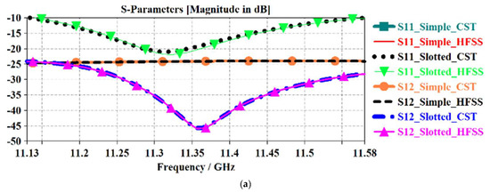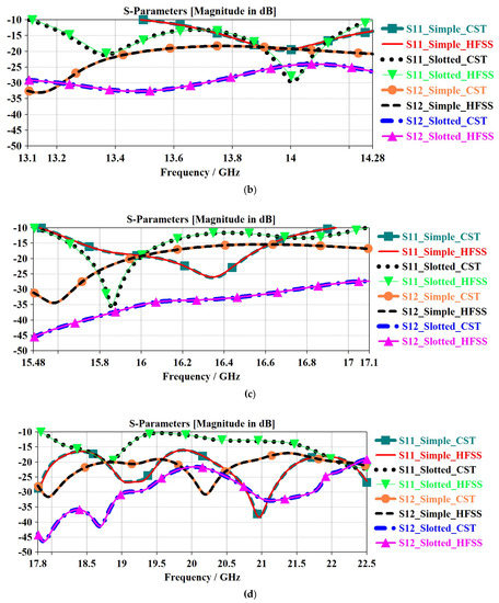 Reflection and transmision coefficients of the reference and proposed antenna array. (a) Coverage over X-band; (b) Coverage over the first Ku-band; (c) Coverage over the second Ku-band; (d) Coverage over the third Ku-band and K-band.