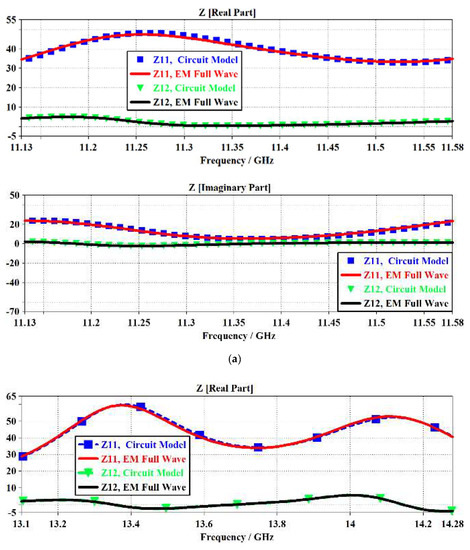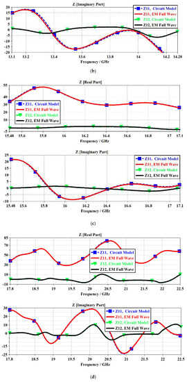 Input impedance (Ω) and admittance (1/Ω) of the proposed slotted array antenna. (a) Coverage over X-band; (b) Coverage over the first Ku-band; (c) Coverage over the second Ku-band; (d) Coverage over the third Ku-band and K-band.