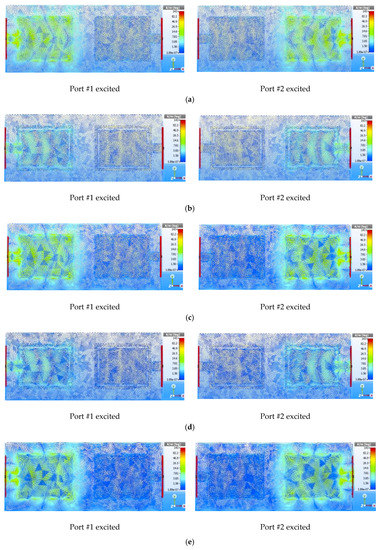 The reference array antenna is a 1 × 2 arrangement of rectangular microstrip patches, as shown in Figure 1a. Standard patch design was used to implement it on a standard FR-4 lossy substrate with dielectric constant of = 4.3, tan = 0.025, and thickness of 1.6 mm. The performance of the antenna was verified using two commercially available 3D electromagnetic tools, namely, CST Microwave Studio® (Darmstadt, Germany) and ANSYS High Frequency Structure Simulator (HFSS). The two patches are identical in size with dimensions of 25 × 20 mm2 and edge-to-edge distance between radiation elements of 10 mm.