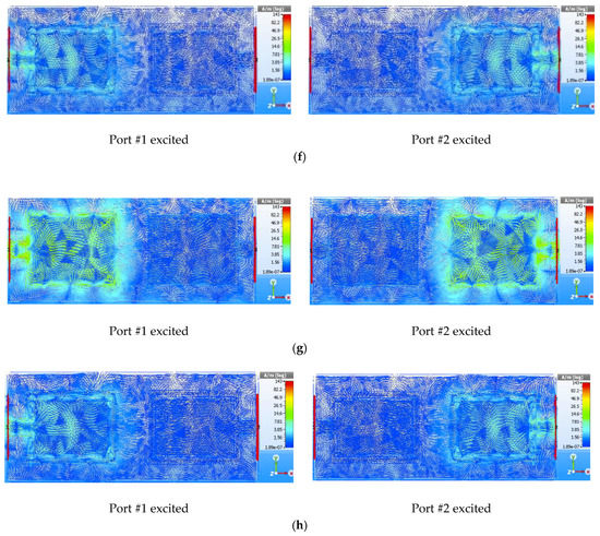 Surface current distribution over the reference and slotted arrays. (a) Reference Array@ 11.37 GHz in X-band; (b) Proposed Slotted Array@ 11.37 GHz in X-band; (c) Reference Array@ 13.6 GHz in Ku-band; (d) Proposed Slotted Array@ 13.6 GHz in Ku-band; (e) Reference Array@ 15.9 GHz in Ku-band; (f) Proposed Slotted Array@ 15.9 GHz in Ku-band; (g) Reference Array@ 18.7 GHz in K-band; (h) Proposed Slotted Array@ 18.7 GHz in K-band.