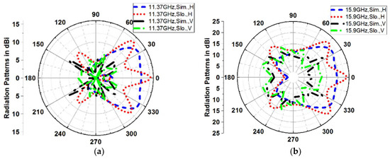 Radiation patterns of the simple reference (sim.) and proposed slotted (slo.) array antennas in the horizontal (H) and vertical (V) planes at (a) 11.37 GHz and (b) 15.9 GHz.