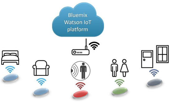 The general system architecture is sketched in Figure 1. It includes a set of sensing devices, a Wi-Fi router, and services installed on a cloud environment. We currently exploit the IBM Bluemix Watson IoT platform (IBM, Armonk, NY, USA). The system is open to third-party and new device addition. We plan to integrate both custom-designed and commercial Wi-Fi devices in a seamless fashion.