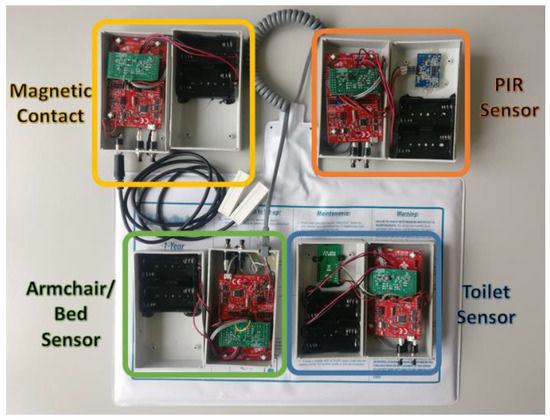 Applications based on such a system have been presented in past works. For example, an infrastructure based on a Passive InfraRed (PIR), bed and temperature sensors was reported in [16]. In this case, data transmission was based on the X10 wireless protocol, and a home server was exploited to process data and to send analyses and alerts to a third person (i.e., the clinician) through emails. Another monitoring system based on temperature, pressure, PIR sensors, and actuators was described in [17]. Sensors communicated with a local computer by means of a wireless ZigBee protocol. Data were processed to monitor the activities of elders, and the results determined which actions were taken. The system proposed in [18] leans on a mix of ZigBee and Power Line Communication (PLC) transmission protocols. The architecture was conceived with distinct ZigBee Wireless Sensor Networks (WSNs) in each room, which communicate with a central management station through a PLC. An infrastructure exploiting a custom wireless protocol, the so called Wellness protocol, was presented in [19]. The implementation was based on temperature, pressure sensors, PIR sensors, a manual alert button, and actuators. Another example of such a system was CARDEA (Computer-Aided, Rule-based Domestic Environment Assistant), developed at the University of Parma and specifically aimed at behavioral analysis. Originally based on the Ethernet protocol [20,21], the system’s strength is flexibility. It is conceived to integrate different kinds of sensors and to support smart interfaces [22,23], in order to tailor the system’s functions to the specific users’ needs. By supporting a wireless protocol (i.e., IEEE 802.15.4/ZigBee) as well, further kinds of devices were introduced; the most remarkable is the wearable sensor MuSA (MUltiSensor Assistant) [24,25,26,27], designed for user motion analysis (e.g., fall monitoring) and for localization and identification purposes [28,29].