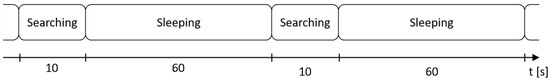 By the analysis of those data, a total mean current of 17.3 mA can be extracted for the first scenario, and a total mean current of 34.5 mA for the second one. This behavior can significantly degrade sensors’ energy performance. To overcome this problem, and hence to extend battery lifetime, the device is forced to follow a duty-cycled sequence of searching and sleeping phases, as shown in Figure 4.