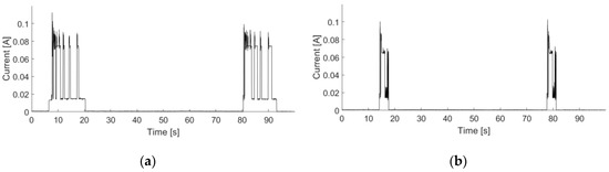 Results are shown in Figure 3. In Figure 3a, the device settles at an almost constant current absorption of 14.2 mA while waiting for the network connection, with an averaged 71.4 mA current while searching for a Wi-Fi connection. In Figure 3b, phases in which the system is not using the radio module (during reboot) with a 101 mA peak current absorption can be identified, as well as a 74.3 mA peak current when the Wi-Fi connection succeeded and tried to establish connection to the cloud.