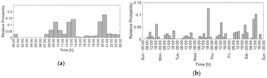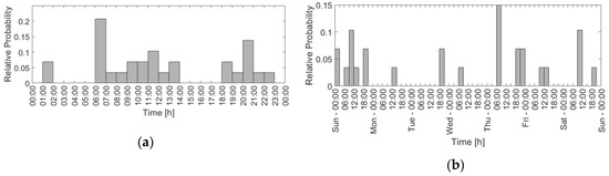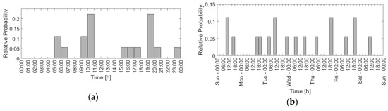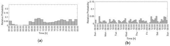 - Daily activity: the distribution of the user-sensor interactions during a 24 h period was analyzed. In Figure 6a, Figure 7a, Figure 8a and Figure 9a the probability of an event in a certain hour of the day is plotted. Values were obtained through the analysis of the activity per hour of every test day. The relative probability was calculated with the equationwhere is the number of events that occurred in the hour, \ and is the total number of events observed during the test.