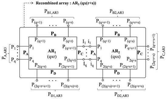 In the proposed UC-DDM, the analysis domain of the original structure is partitioned into the coupled sub-domains of the UCs. The solution of the sub-domain is analytically extracted in the previous section. To reconstruct the original domain using the sub-domain results, a method to recombine the Z-parameters of the sub-domains was developed and named the Z-parameter recombination method (ZRM). Figure 6 depicts a block diagram of two sub-domains to be recombined. The sub-domains are denoted as AR1 and AR2 while the recombined result is denoted as AR3. For convenient application of ZRM to the 2-D truncated EBG array, the multiple ports are arranged in a rectangular order. The sub-domain contains four port groups of PA, PB, PC, and PD. Considering the symmetric nature of the EBG array, we assume the same number of ports q in PA and PC for both AR1 and AR2. In contrast, the port number of PB, PD of AR1 is different from those of AR2 for the general use of ZRM. The port number of PB, PD of AR1 and AR2 is r and s, respectively. The port number of PA, PC of the recombined domain AR3 is the same as those of AR1 or AR2. On the other hand, the port number of PB, PD of AR3 is (r + s), which is the sum of port numbers of AR1 and AR2.