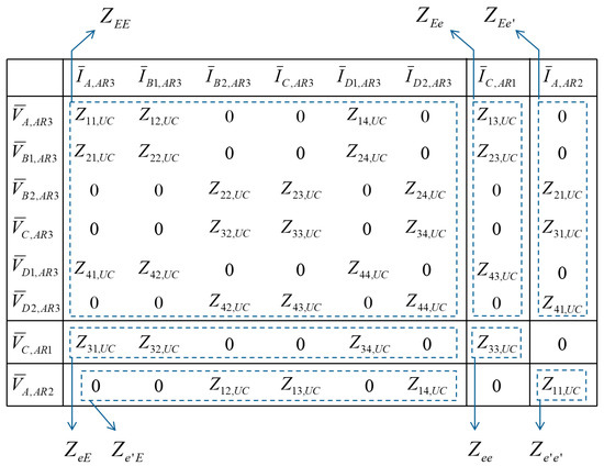 In the proposed UC-DDM, the truncated EBG structure is divided into the UCs by inserting a perfect magnetic conductor (PMC) as a boundary condition. It is shown that the PMC-based decomposition is efficient for the PP-EBG structure in high-speed PCBs. The PMC boundary yields the same voltage and continuous current conditions at the interface between the sub-domains, which is equal to the connection point meeting the port group PC of AR1 with the port group of PA of AR2. With this condition and the segmentation theory introduced in [23], we could derive the Z-parameter of the recombined domain from the Z-parameters of the sub-domains. To utilize the theory in [23] for the ZRM, we created an impedance table showing the relationship between the Z-parameters of the sub-domains and the recombined domain, as shown in Figure 7. In the impedance table of Figure 7, the new Z-parameters of ZEE, ZEe, ZEe′, ZeE, Ze′E, Zee, and Ze′e′ are defined. The Z-parameter of the recombined domain AR3 can thus be obtained by the following: