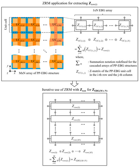 The ZRM for the 1 × 2 array is shown above. To efficiently obtain the Z-parameter of the PP-EBG structure with the M × N array, we iteratively perform the ZRM. The method to iteratively employ the ZRM entails two steps—namely, the ZRM applications for Zrow(i) and ZEBG(M×N). Zrow(i) is the Z-parameter of the 1 × N EBG array, and ZEBG(M×N) is the Z-parameter of the M × N EBG array with the PPN suppression characteristics that we originally needed to examine. In the first step for Zrow(i), we start by recombining two UCs for a 1 × 2 array and the ZRM is sequentially applied to a 1 × N array to obtain Zrow(i). This step is represented as follows: