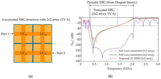 (a) A simulation model of the truncated EBG structure with a 2 × 2 array and (b) comparison of PPN suppressions of the UC-DDM and the full-wave simulation.