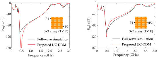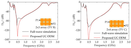 To further validate the UC-DDM, the PPN suppression characteristics (i.e., S21 parameters) were examined using TVs, including different array size and port configurations. As shown in Figure 10, TV B and TV C are PP-EBG structures with 2 × 3 and 2 × 4 arrays, respectively. TV D and TV E contain the same array size of 3 × 3 but different port configurations, as shown in Figure 11. The S21 parameters of TV B (2 × 3 array), TV C (2 × 4 array), and TV D (3 × 3 array) from the full-wave simulation and the UC-DDM are depicted in Figure 10 and Figure 11. The UC-DDM results show good agreement with the full-wave simulation results regardless of the various array sizes. For the different port configurations in Figure 11, the UC-DDM shows good correlation with the full-wave simulation results. Through all TVs, we can observe high accuracy of the UC-DDM regarding prediction of the resonance peaks as well as the PPN suppression bandwidth, thus achieving efficient estimation over a wideband frequency range.