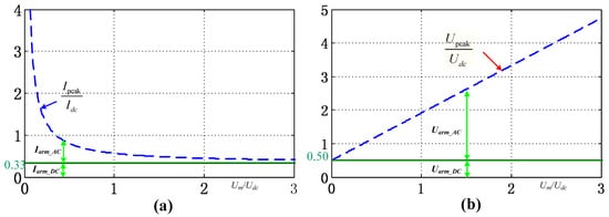 Substituting (12) into (9), the peak values of arm voltage and arm current can be expressed as