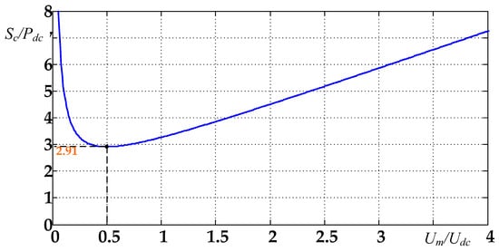 With Equation (17), the relationship of the converter rating of MMC-DDI with its AC-side voltage can be calculated and shown as Figure 3. As it shown, under a certain DC-side output voltage and power requirement, the converter rating varies greatly with its AC input voltage. It can be analytically solved that when and only when Um = 0.5 Udc, the converter rating gets its minimum value, and the minimum rating is 2.91 times the output ice-melting power. This conclusion can be expressed as
