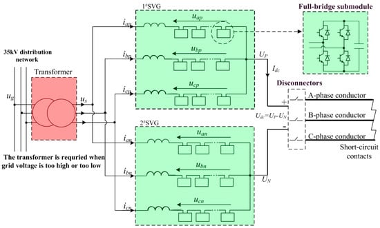 - SVG Mode. When there is no icing line, the de-icing disconnectors can be open circuit. Then, the upper three arms and the lower three arms can operate as two parallel conventional SVGs, and provide reactive power compensation or alleviate other power quality problems.