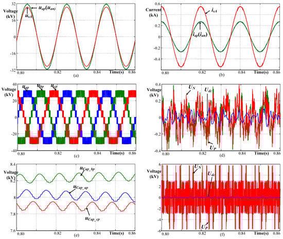 Similarly, the B-phase and C-phase arm voltage/current can also be expressed. As shown in Equations (5)–(8), the voltage/current of each arm contains both AC and DC components. Moreover, their peak values are the same for each arm, and can be expressed as