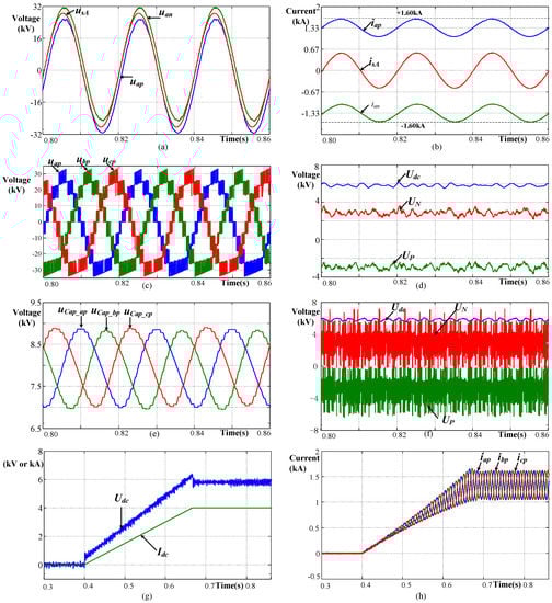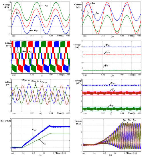 In the last few decades, modular multilevel converter (MMC) topology has been rapidly developed [,]. Since it was presented for the first time by Lesnicar and Marquardt in 2003 [], it has been widely used in many high-voltage and medium-voltage applications [,,]. It can output a smooth and nearly ideal sinusoidal voltage with little filters, and it has modularity and scalability, and is facile and flexible. The main application of MMC is VSC-based HVDC transmission [,]. In the last five years, dozens of large-capacity MMC-based HVDC systems have been built [], their rated DC voltage is up to ±500 kV and their rated power is hundreds of MW or even 2000 MW. Another typical application of MMC is the STATCOM []. In recent years, most of the STATCOM above 10 Mvar have adopted the MMC structure.