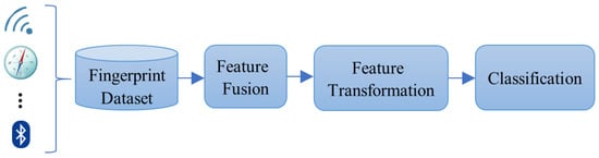 The approach followed in this research work consisted of a methodology formed by four phases: data gathering or dataset building, feature fusion, feature transformation, and classification. The methodology is presented in Figure 1. First, a dataset is built with valuable information for each reference location in the environment, such as RSS from Wi-Fi access points, orientation from a compass, Bluetooth beacons, or landmark information. Next, these features are fused into a vector to gather the key properties in every reference location. After that, this vector is transformed into principal components, reducing the data dimensionality and improving the computational performance of the system. Finally, these principal components are applied as input parameters in a classification-based machine learning algorithm to build an indoor localization model. In the following sections, each phase is explained.