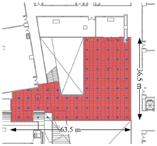 The dataset was built at the University of Yuan Ze, Taiwan, concretely on the fourth floor of the telecommunications building [29]. Figure 3 shows the layout area of the testbed environment, which is 36.5 m wide and 63.5 long, and there were 41 access points present. A total of 70 reference locations with a spacing of 1.2–2 m was defined to gather RSS values. In addition, four orientations (with intervals of 90) were set to measure the RSS values at each reference location. For each orientation and location, 50 RSS values were gathered. Hence, the dataset had 14,000 instances, each instance containing 41 RSS values and one orientation value. Furthermore, 23 different locations were used for the online phase, recording also 50 RSS values and four orientation angles for each one. Thus, the online phase contained 4600 instances.