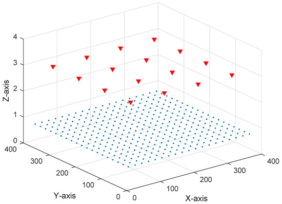 For this dataset, we have used the Communication and Lighting Emulation Software (CandLES) [30], which allowed us to calculate RSS values and other features, such as the channel impulse response, , in a VLC network. This software implements a fast multi-receiver channel estimation for indoor optical wireless communications [31]. The calculations for this model take into account, among others, factors such as localization of the light sources and receivers, the reflectance of the obstacles and walls, the optical sensor area in each receiver, and also the number of signal reflections. The scenario designed to build the dataset is the room shown in Figure 4, which is 4 m wide, 4 m long, and 3 m in height without obstacles. As light sources, 16 LED lamps (red triangles) of 15 W were set up, distributed in a 4 × 4 grid with 1-m separation from each other. As receivers, 361 devices (blue circles) were set up in a 19 × 19 grid placed 20 cm equidistant. All receivers had the following configuration: a photo sensor of 100 mm with an optical concentrator gain of 10, a value of 60 for the Field Of View (FOV), and a concentrator refractive index of 2.73. Furthermore, in order to consider a 3D localization, three different heights of receivers were evaluated. The distances from the floor were 125, 100, and 75 cm. Lastly, a different reflectivity index was set for the ceiling, wall, and floor, that is 0.69, 0.58, and 0.09, respectively.