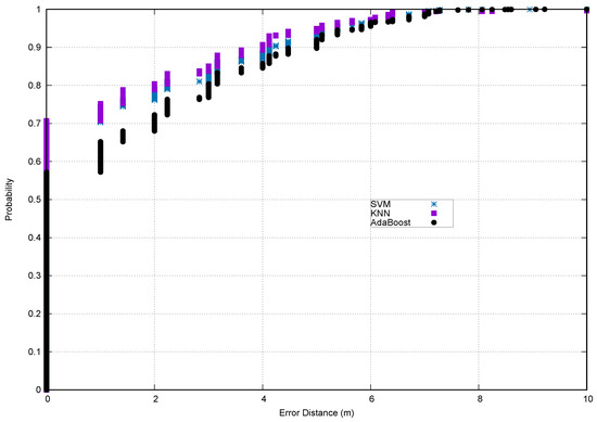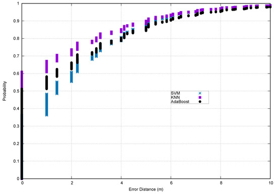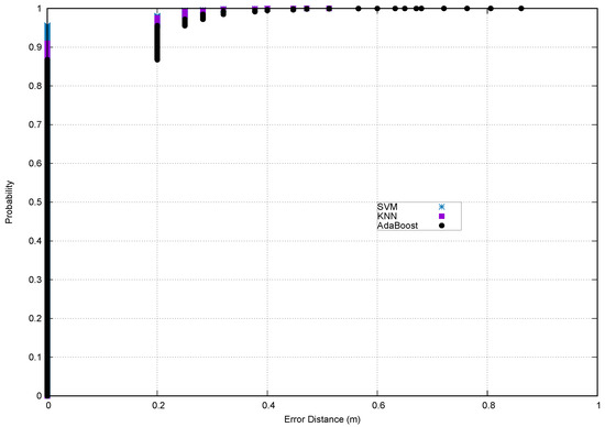 Lastly, Figure 5, Figure 6 and Figure 7 show the Cumulative Distribution Function (CDF) using the proposed methodology. As can be seen, for the Mannheim dataset, the error was about 2 m with a 75% probability using KNN as the classifier, and furthermore, it was about 5 m with a 90% probability using any classifier. Something similar occurred for the Yuan Ze dataset: the error was about 2 m with a 80% probability using KNN as the classifier, and the error was about 4 m with a 90% probability using any classifier. For both datasets, at the 90th percentile and above, the accuracy was comparable in all classifiers. For the VLC dataset, most of the test instances were correctly classified, and most of the misclassified instances were about 20 cm for all classifiers, that is the error was about 20 cm with a 95% probability. Therefore, the experimental results demonstrated that the proposed methodology yielded an acceptable accuracy, with a reduction of computation time.