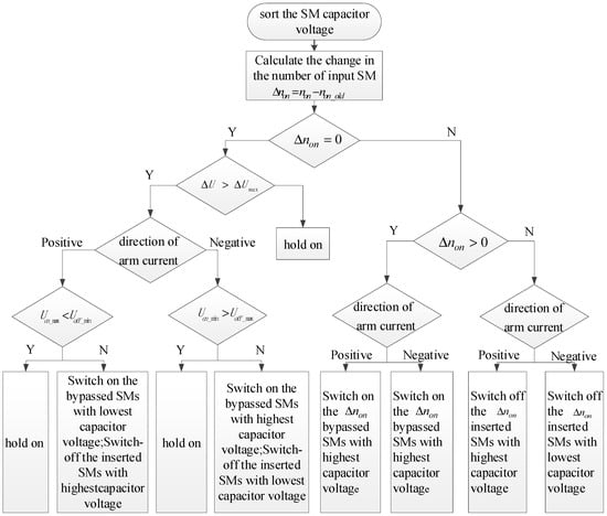 Flowchart of the proposed sub-module (SM) capacitor voltage balancing algorithm.
