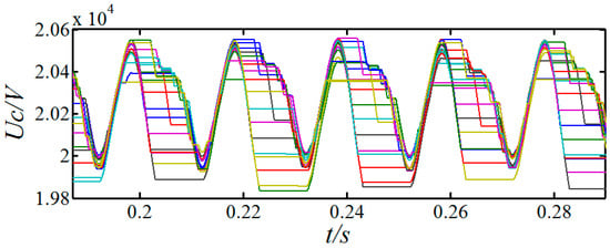 As a comparison, the performance of the proposed auto-optimized voltage balancing algorithm based on the maximum voltage deviation automatic threshold is analyzed. In simulation, the capacitance target deviation are set as 800 V, 500 V, 200 V and 50 V. The waveforms of each upper arm SM capacitor voltages are shown in Figure 7. The SM capacitor voltages still remain stable. In addition, it is observed that, the deviation of the SM capacitor voltages decreases by controlling the capacitance target deviation .