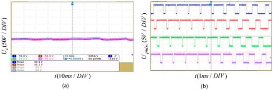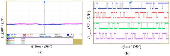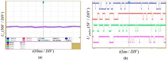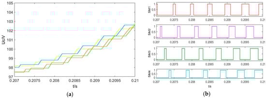 Figure 18 shows the four SM capacitor voltages waveforms of the upper arm and the trigger pulse of the SMs without voltage balancing control. It can be seen that the corresponding average switching frequency of the SMs is 2100 Hz, and the SM maximum voltage deviation compared with the rated voltage (100 V) is 5.0 V. The voltage amplitudes of the SMs are quite inconsistent. Figure 19 shows the waveforms of the SM capacitor voltages and the trigger pulse of the SMs by the sorting algorithm. The deviation between the four SM capacitor voltages is well controlled. However, the average switching frequency of the SMs is 3800 Hz, which is an increase of 81% compared with the switching frequency without voltage balancing control. The above results show that the sorting algorithm can reduce the deviation between SM capacitor voltages, but the switching frequency and switching loss of the MMC system is also increased.
