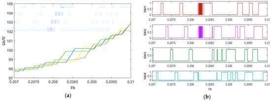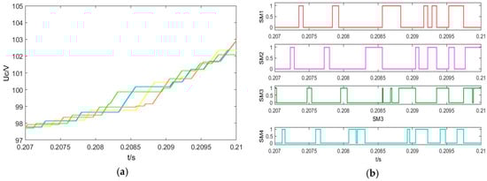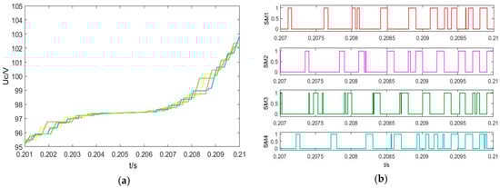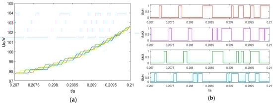 SM capacitor voltage balancing results using sorting algorithm. (a) SM capacitor voltages of the upper arm. (b) Trigger pulse of the SMs.
