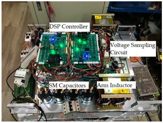 The upper and lower arm experimental setup of a single phase (consist of four SMs per arm) is illustrated in Figure 13. Each half-bridge SMs is built by using Mitsubishi CM100DY-24 A IGBT modules (1200 V/100 A, Mitsubishi Electric, Tokyo, Japan), whilst the SM capacitors are the EPCOS 2200 uF/450 V electrolytic capacitor (TDK Electronics AG, Munich, Germany). The proposed algorithm for single phase, i.e., per leg, is implemented by the Texas DSP TMS320F28335 with 150 MHz operating frequency. Such a controller has a 12-bit ADC module with 16-channels, which are adequate to sense the SM capacitor voltages and arm current.