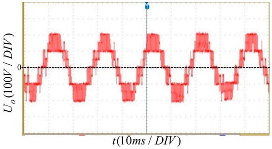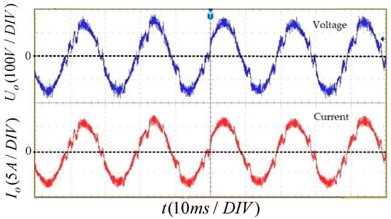 The five-level output voltage waveforms of the upper and lower bridge arms and the single phase MMC with no load are shown in Figure 15 and Figure 16 respectively. Figure 17 shows the 50 Hz sinusoidal output voltage and current waveforms of the single phase MMC with a 25 Ω resistance load. As shown in Figure 16, when there is no resistance on the AC output side, the output side voltage level is five. As shown in Figure 17, when a purely resistive load is applied to the output side without filtering mean, the sinusoidal voltage current waveform can be obtained on the output side. Therefore, these results indicate a good output performance of the MMC.